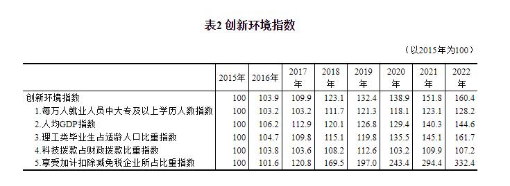 二、創新環境明顯優化 “創新環境”領域包括每萬人就業人員中大專及以上學歷人數、人均GDP、理工類畢業生佔適齡人口比重、科技撥款佔財政撥款比重、享受加計扣除減免稅企業所佔比重等5個指標。 以2015年為100,2022年中國創新環境指數為160.4,年均增長7.0%。分指標看,享受加計扣除減免稅企業所佔比重指數大幅提升,年均增速達18.7%,2022年指數值達332.4,在中國創新指數的全部18個指標中位列第一;理工類畢業生佔適齡人口比重指數、人均GDP指數、每萬人就業人員中大專及以上學歷人數指數、科技撥款佔財政撥款比重指數的年均增速分別為7.1%、5.4%、3.6%和1.0%,2022年指數值相應為161.7、144.6、128.2和107.2(詳見表2)。