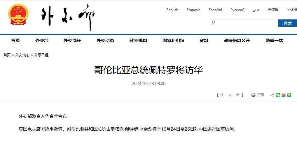 香港新聞網10月23日電 據中國外交部網站10月23日消息,外交部發言人華春瑩宣佈:應國家主席習近平邀請,哥倫比亞共和國總統古斯塔沃·佩特羅·烏雷戈將於10月24日至26日對中國進行國事訪問。