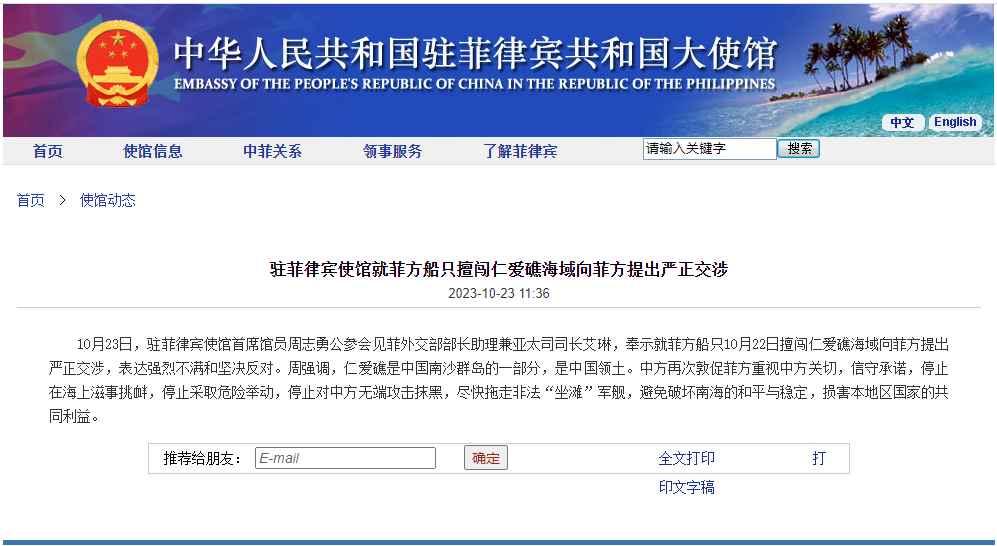 香港新聞網10月23日電 據中國駐菲律賓大使館網站消息,10月23日,駐菲律賓使館首席館員周志勇公參會見菲外交部部長助理兼亞太司司長艾琳,奉示就菲方船隻10月22日擅闖仁愛礁海域向菲方提出嚴正交涉,表達強烈不滿和堅決反對。
