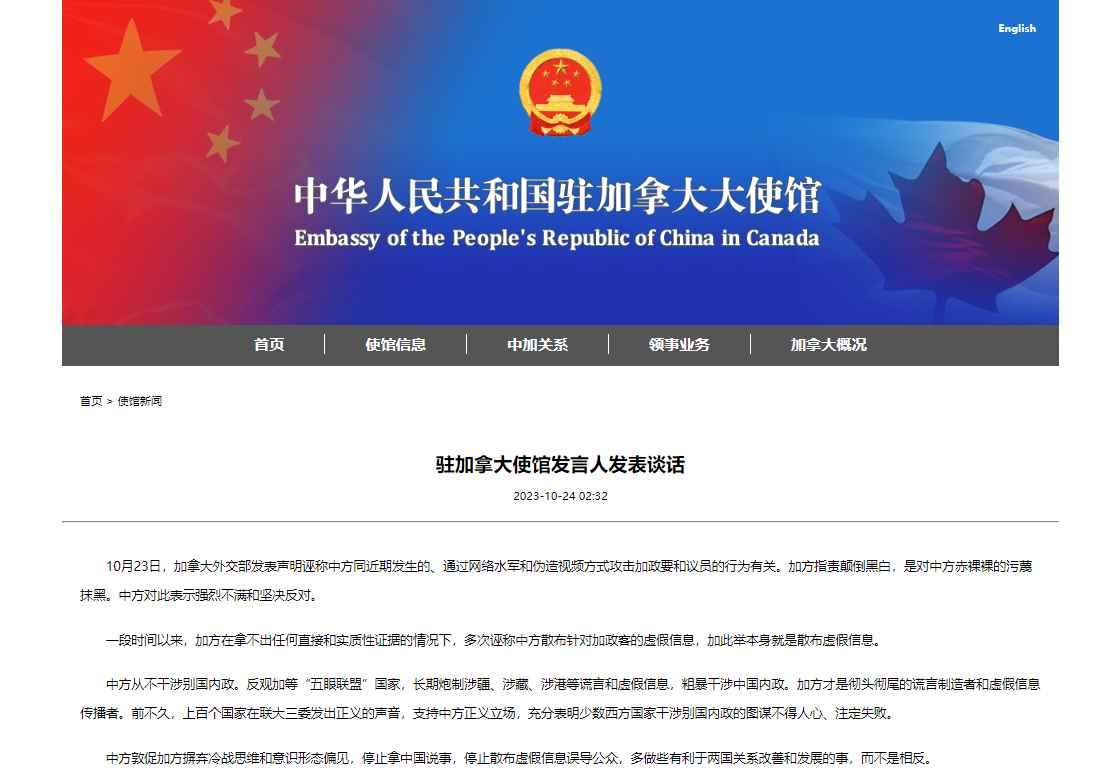 香港新聞網10月24日電 據中國駐加拿大使館網站10月24日消息,23日,加拿大外交部發表聲明誣稱中方同近期發生的、通過網絡水軍和偽造視頻方式攻擊加政要和議員的行為有關。加方指責顛倒黑白,是對中方赤裸裸的污衊抹黑。中方對此表示強烈不滿和堅決反對。