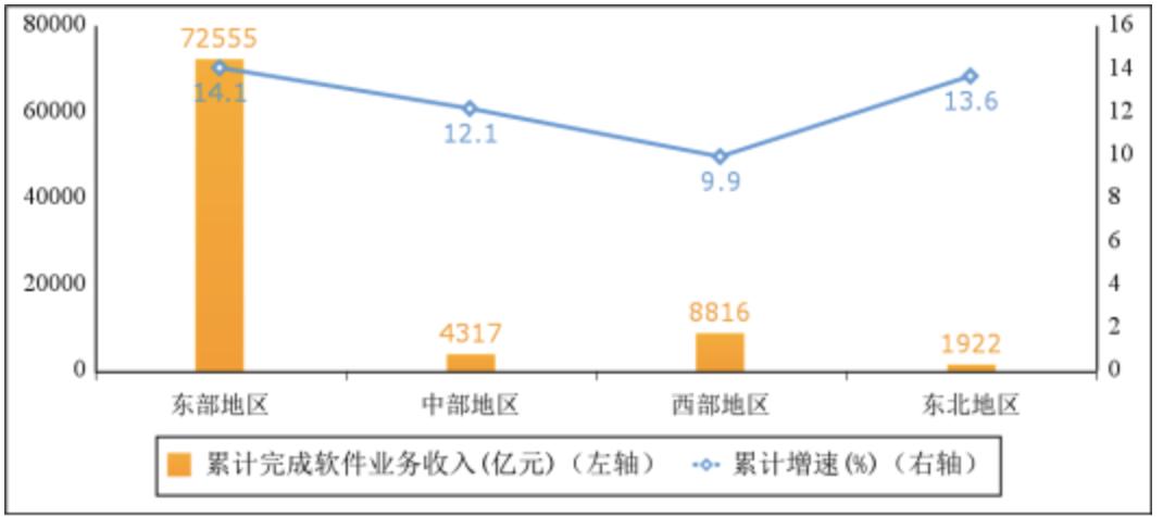圖4 2022年和2023年前三季度軟件業分類收入佔比情況 三、分地區運行情況 中、西部地區軟件業務收入小幅回落,東部地區增勢突出。前三季度,東部地區完成軟件業務收入72555億元,同比增長14.1%,增速較1—8月份提高0.1個百分點;中部地區完成軟件業務收入4317億元,同比增長12.1%,增速較1—8月份回落1個百分點;西部地區完成軟件業務收入8816億元,同比增長9.9%,增速較1—8月份回落0.2個百分點;東北地區完成軟件業務收入1922億元,同比增長13.6%,增速較1—8月份提高0.3個百分點。四個地區軟件業務收入佔全國比重分別為82.8%、4.9%、10.1%和2.2%。