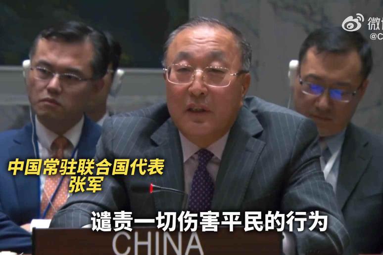 視頻截圖 張軍:尊敬的以色列常駐代表,同以色列在這裏辯論不是我的本意。以色列把中國當成對手,也選錯了對象。你應該明白,從這一輪巴以衝突開始,中方就以非常明確無誤的語言,譴責一切傷害平民、違反國際法的行為。我們所說的平民,既包括巴勒斯坦平民,也包括以色列平民。 第二,你就今天的決議發表了評論,但我也要提醒你注意到,就在上周,(就)安理會一份同樣包含了譴責哈馬斯攻擊行為的決議,中國投了贊成票,而這項決議遭到了否決。 第三,我在剛才的發言中明確地提到,中國絕不是否認以色列的安全關切。相反,我們一直主張,同等重視以色列和巴勒斯坦雙方的安全關切和合法權利。當前的形勢下,我們在處理好這一輪巴以衝突的同時,不能否認巴勒斯坦人民的權利長期以來沒有得到根本的保障。我們也認為,衝突的根源在於“兩國方案”沒有得到很好的解決。 我希望,我們都能夠本著誠實的態度,尊重事實、堅守正義,通過我們的共同努力,既解決好當前的問題,也能夠讓以色列人民和巴勒斯坦人民能夠共同生活在和諧、平安、幸福之中。 【編輯:丘志彬】