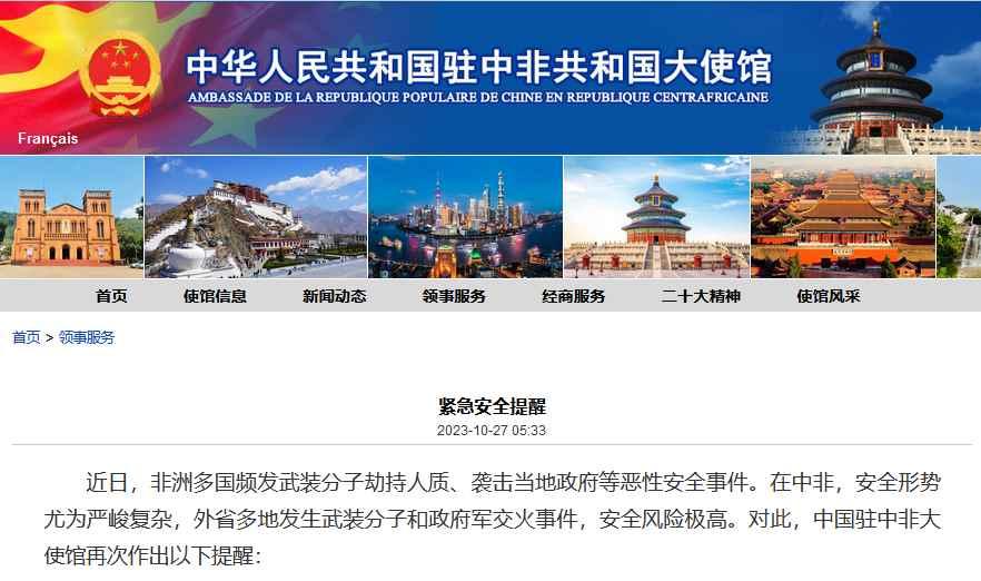 香港新聞網10月27日電 據中國駐中非共和國大使館網站消息,近日,非洲多國頻發武裝分子劫持人質、襲擊當地政府等惡性安全事件。在中非,安全形勢尤為嚴峻複雜,外省多地發生武裝分子和政府軍交火事件,安全風險極高。對此,中國駐中非大使館再次作出以下提醒: