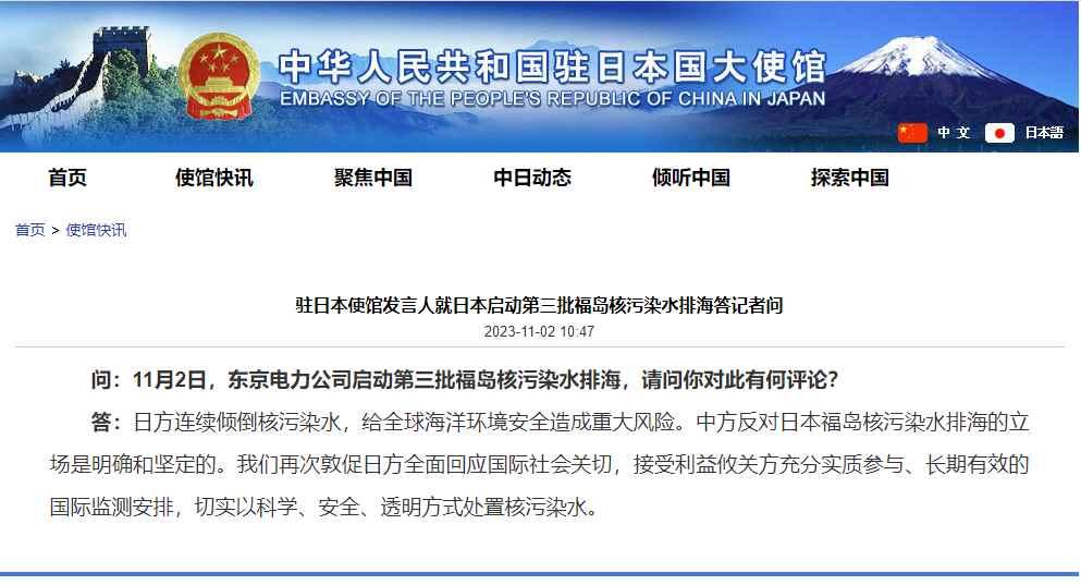 中國駐日本大使館網站截圖 有記者問,11月2日,東京電力公司啟動第三批福島核污染水排海,請問你對此有何評論? 中國駐日本使館發言人表示,日方連續傾倒核污染水,給全球海洋環境安全造成重大風險。中方反對日本福島核污染水排海的立場是明確和堅定的。我們再次敦促日方全面回應國際社會關切,接受利益攸關方充分實質參與、長期有效的國際監測安排,切實以科學、安全、透明方式處置核污染水。 【編輯:丘志彬】