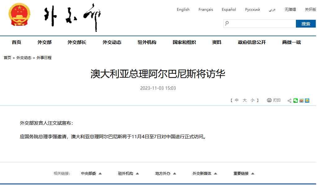應國務院總理李強邀請,澳大利亞總理阿爾巴尼斯將於11月4日至7日對中國進行正式訪問。