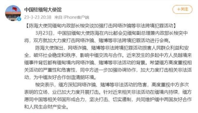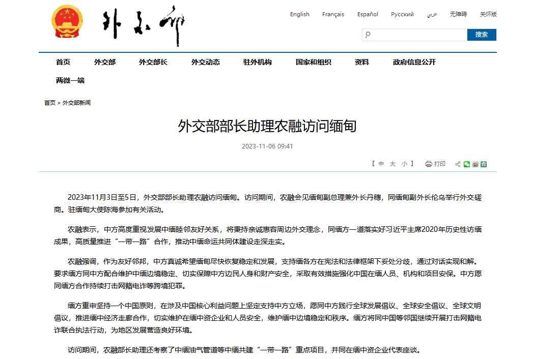 中國外交部網站截圖 農融表示,中方高度重視發展中緬睦鄰友好關係,將秉持親誠惠容周邊外交理念,同緬方一道落實好習近平主席2020年歷史性訪緬成果,高質量推進“一帶一路”合作,推動中緬命運共同體建設走深走實。 農融強調,作為友好鄰邦,中方真誠希望緬甸盡快恢復穩定和發展,支持緬各方在憲法和法律框架下妥處分歧,通過對話實現和解。要求緬方同中方配合維護中緬邊境穩定、切實保障中方邊民人身和財產安全,採取有效措施強化中國在緬人員、機構和項目安保。中方願同緬方合作持續打擊網賭電詐等跨境犯罪。 緬方重申堅持一個中國原則,在涉及中國核心利益問題上堅定支持中方立場,願同中方踐行全球發展倡議、全球安全倡議、全球文明倡議,推進緬中經濟走廊合作,切實維護在緬中資企業和人員安全,維護緬中邊境穩定和秩序。緬方將同中國等鄰國繼續開展打擊網賭電詐聯合執法行動,為地區發展營造良好環境。 訪問期間,農融部長助理還考察了中緬油氣管道等中緬共建“一帶一路”重點項目,並同在緬中資企業代表座談。 【編輯:丘志彬】