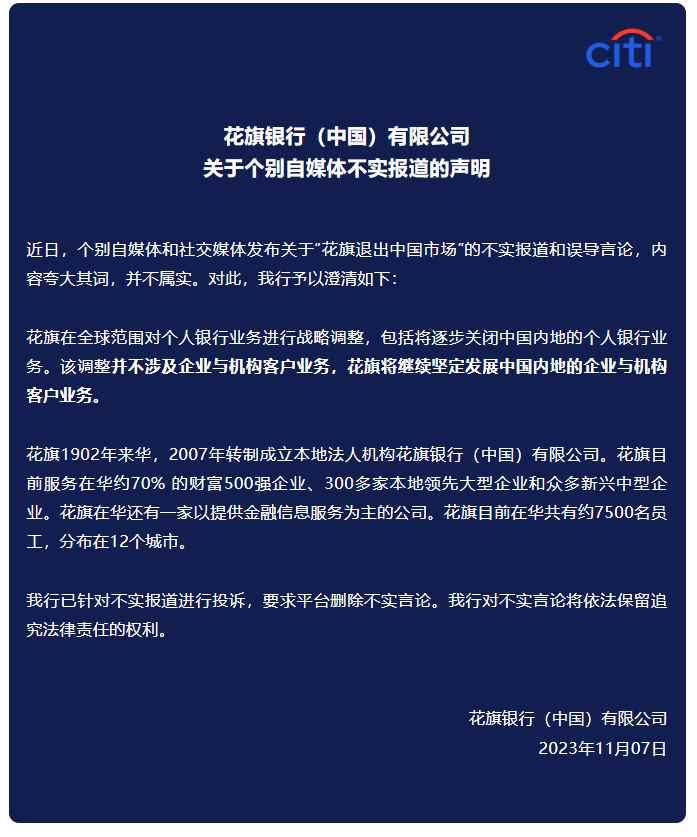 香港新聞網11月7日電 10月9日,花旗集團發佈聲明稱,已同意向匯豐銀行(中國)出售中國內地的個人銀行財富管理業務,包括個人客戶持有的賬戶、存款和相關理財產品。相關消息被部分自媒體解讀為“花旗銀行宣佈退出中國”,引發關注。 據花旗商業銀行微信公眾號消息,11月7日,花旗銀行(中國)有限公司發佈關於個別自媒體不實報道的聲明,近日,個別自媒體和社交媒體發佈關於“花旗退出中國市場”的不實報道和誤導言論,內容誇大其詞,並不屬實。對此,我行予以澄清如下: 花旗在全球範圍對個人銀行業務進行戰略調整,包括將逐步關閉中國內地的個人銀行業務。該調整並不涉及企業與機構客戶業務,花旗將繼續堅定發展中國內地的企業與機構客戶業務。 花旗1902年來華,2007年轉制成立本地法人機構花旗銀行(中國)有限公司。花旗目前服務在華約70% 的財富500強企業、300多家本地領先大型企業和眾多新興中型企業。花旗在華還有一家以提供金融信息服務為主的公司。花旗目前在華共有約7500名員工,分佈在12個城市。 我行已針對不實報道進行投訴,要求平台刪除不實言論。我行對不實言論將依法保留追究法律責任的權利。