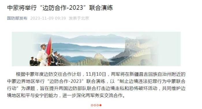 香港新聞網11月9日電 據中國國防部發佈微信公眾號消息,根據中蒙年度邊防交往合作計劃,11月10日,兩軍將在新疆昌吉回族自治州附近的中蒙邊界地區舉行“邊防合作-2023”聯合演練,以“制止邊境違法犯罪行為中蒙聯合行動”為課題,旨在提升兩國邊防部隊聯合打擊邊境走私和恐怖破壞活動,共同維護邊境地區和平與安寧的能力,進壹步深化兩軍務實交流合作。