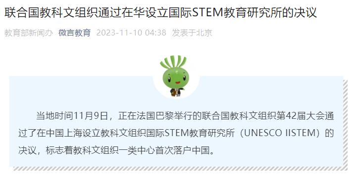 香港新聞網11月10日電 據中國教育部新聞辦微信公眾號“微言教育”11月10日消息,當地時間11月9日,正在法國巴黎舉行的聯合國教科文組織第42屆大會通過了在中國上海設立教科文組織國際STEM教育研究所(UNESCO IISTEM)的決議,標誌著教科文組織一類中心首次落戶中國。