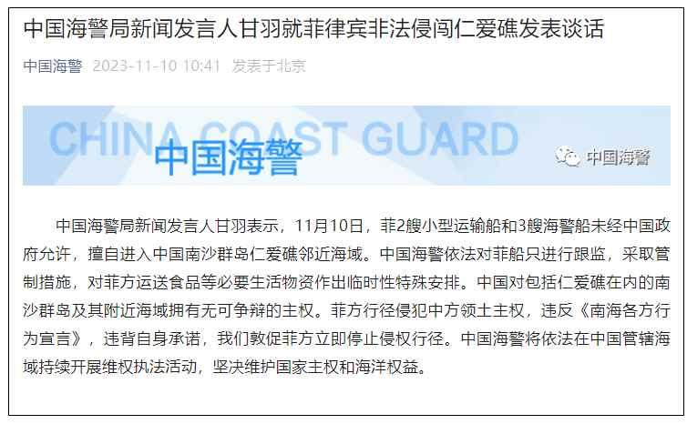香港新聞網11月10日電 據中國海警局官方微博消息,中國海警局新聞發言人甘羽就菲律賓非法侵闖仁愛礁發表談話。 中國海警局新聞發言人甘羽表示,11月10日,菲2艘小型運輸船和3艘海警船未經中國政府允許,擅自進入中國南沙群島仁愛礁鄰近海域。中國海警依法對菲船只進行跟監,採取管制措施,對菲方運送食品等必要生活物資作出臨時性特殊安排。中國對包括仁愛礁在內的南沙群島及其附近海域擁有無可爭辯的主權。菲方行徑侵犯中方領土主權,違反《南海各方行為宣言》,違背自身承諾,我們敦促菲方立即停止侵權行徑。中國海警將依法在中國管轄海域持續開展維權執法活動,堅決維護國家主權和海洋權益。