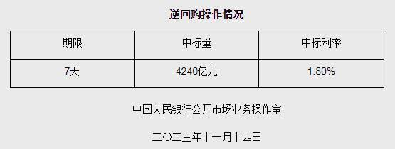香港新聞網11月14日電 據央行網站消息,為維護銀行體系流動性合理充裕,2023年11月14日人民銀行以利率招標方式開展了4240億元逆回購操作,中標利率1.80%,期限為7天。具體情況如下: