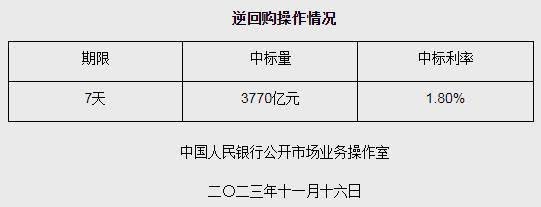 香港新聞網11月16日電 據央行網站消息,為維護銀行體系流動性合理充裕,2023年11月16日人民銀行以利率招標方式開展了3770億元逆回購操作,中標利率1.80%,期限為7天。具體情況如下: