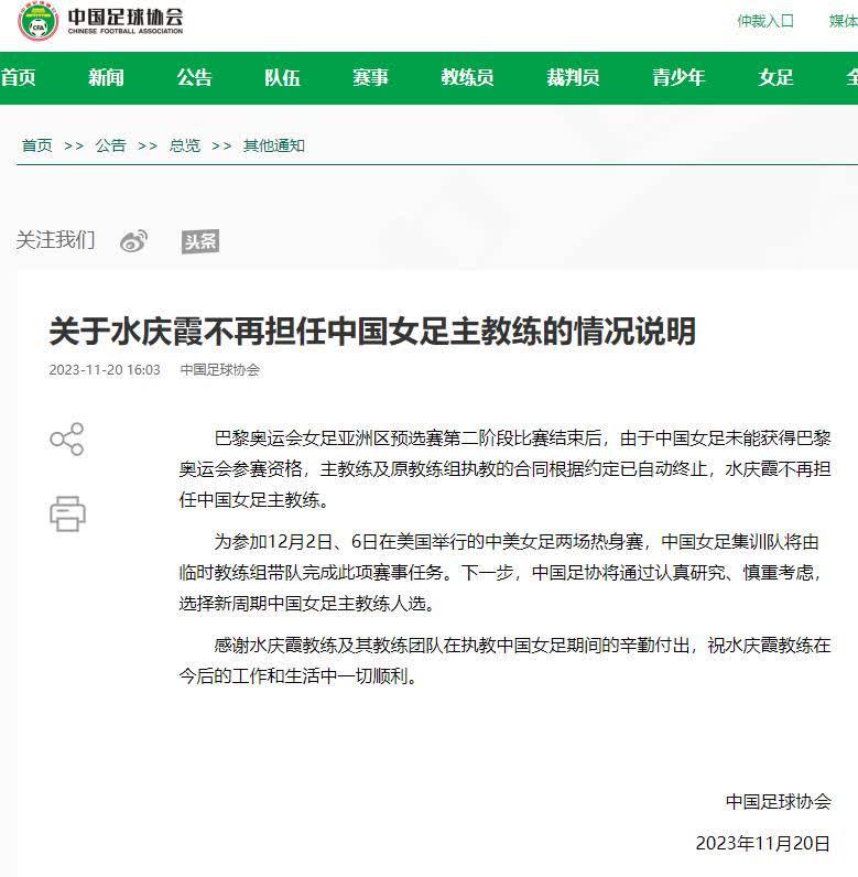 香港新聞網11月20日電 11月20日,中國足球協會發布《關於水慶霞不再擔任中國女足主教練的情況說明》,巴黎奧運會女足亞洲區預選賽第二階段比賽結束後,由於中國女足未能獲得巴黎奧運會參賽資格,主教練及原教練組執教的合同根據約定已自動終止,水慶霞不再擔任中國女足主教練。 為參加12月2日、6日在美國舉行的中美女足兩場熱身賽,中國女足集訓隊將由臨時教練組帶隊完成此項賽事任務。下一步,中國足協將通過認真研究、慎重考慮,選擇新周期中國女足主教練人選。 感謝水慶霞教練及其教練團隊在執教中國女足期間的辛勤付出,祝水慶霞教練在今後的工作和生活中一切順利。