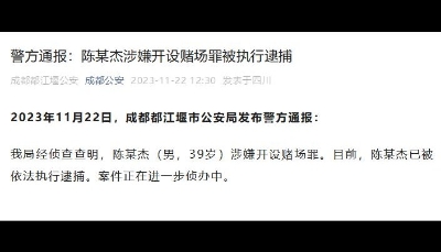 香港中通社11月22日電 成都都江堰市公安局22日發布警方通報:該局經偵查查明,陳某傑(男,39歲)涉嫌開設賭場罪。目前,陳某傑已被依法執行逮捕。案件正在進一步偵辦中。前一日晚,中國知名直播平台“鬥魚”發布公告稱,公司首席執行官(CEO)陳少傑於16日左右被成都警方逮捕。