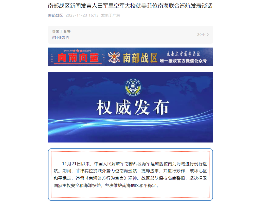 香港新聞網11月23日電 據中國南部戰區微信公眾號消息,南部戰區新聞發言人田軍里空軍大校就美菲位南海聯合巡航發表談話:
