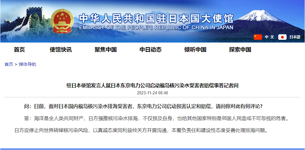 中國駐日大使館網站截圖 問:日前,面對日本國內福島核污染水排海受害者,東京電力公司啟動損害認定和賠償,請問妳對此有何評論? 答:海洋是全人類共同財產,日方強推核污染水排海,不僅損及自身,也給其他國家特別是鄰國人民造成不可忽視的危害。日方應停止向世界轉嫁核污染風險,以真誠態度同利益攸關方開展溝通,本著負責任和建設性態度妥善處理排海問題。 【編輯:丘志彬】