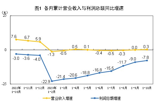 圖自中國國家統計局網站 1—10月份,主要行業利潤情況如下:電力、熱力生產和供應業利潤總額同比增長50.1%,黑色金屬冶煉和壓延加工業增長37.0%,電氣機械和器材製造業增長20.8%,通用設備製造業增長10.4%,專用設備製造業增長2.0%,汽車製造業增長0.5%,有色金屬冶煉和壓延加工業下降3.7%,紡織業下降6.1%,石油和天然氣開採業下降8.9%,農副食品加工業下降16.5%,計算機、通信和其他電子設備製造業下降18.2%,非金屬礦物製品業下降26.5%,煤炭開採和洗選業下降26.6%,石油、煤炭及其他燃料加工業下降27.0%,化學原料和化學製品製造業下降42.8%。 1—10月份,規模以上工業企業實現營業收入107.78萬億元,同比增長0.3%;發生營業成本91.63萬億元,增長0.6%;營業收入利潤率為5.67%,同比下降0.50個百分點。