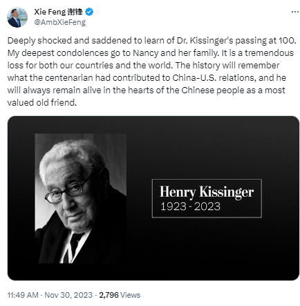 謝鋒在X上的帖文截圖 圖源:社交平台X 謝鋒在帖文中寫道,“得知基辛格博士去世,享年100歲,深感震驚和悲痛。我向南希(基辛格夫人)和她的家人致以最深切的哀悼。這對我們兩國和世界來說都是巨大損失。歷史將銘記這位百歲老人為中美關係作出的貢獻。作為一位最珍貴的老朋友,他將永遠活在中國人民心中。” 據媒體介紹,基辛格曾在中美建交中扮演了重要角色。1971年,時任美國總統國家安全事務助理的基辛格秘密訪華,與中方攜手促成了1972年尼克松總統對中國進行的“破冰之旅”,實現了震撼世界的“跨越太平洋的握手”。半個世紀以來,基辛格始終關注中國,先後約百次訪問中國,成為中國人民最熟悉的外國面孔之一。 【編輯:凌玉辉】