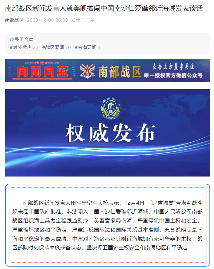 香港新聞網12月4日電 據微信公眾號“南部戰區”消息,南部戰區新聞發言人就美艦擅闖中國南沙仁愛礁鄰近海域發表談話。 南部戰區新聞發言人田軍里空軍大校表示,12月4日,美“吉福茲”號瀕海戰鬥艦未經中國政府批準,非法闖入中國南沙仁愛礁鄰近海域,中國人民解放軍南部戰區組織海上兵力全程跟監警戒。美蓄意攪局南海,嚴重侵犯中國主權和安全,嚴重破壞地區和平穩定,嚴重違反國際法和國際關係基本準則,充分說明美是南海和平穩定的最大威脅。中國對南海諸島及其附近海域擁有無可爭辯的主權,戰區部隊時刻保持高度戒備狀態,堅決捍衛國家主權安全和南海地區和平穩定。(完)