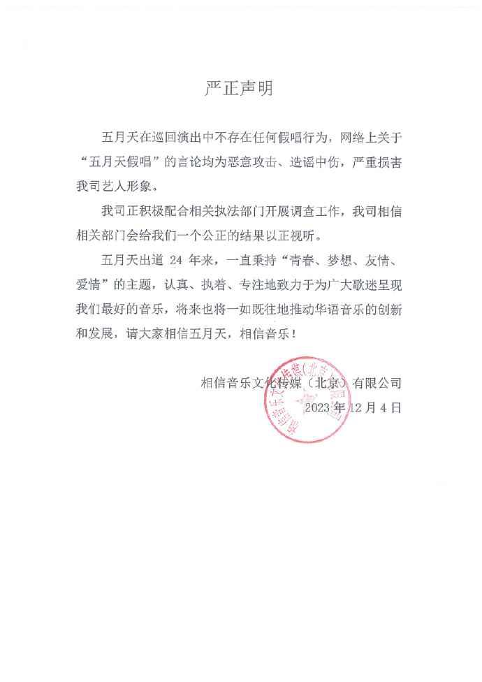 香港新聞網12月5日電 五月天經紀公司微博@相信音樂Bin-music 12月4日傍晚發佈聲明稱,“五月天在巡回演出中不存在任何假唱行為,網絡上關於"五月天假唱"的言論均為惡意攻擊、造謠中傷,嚴重損害藝人形象。公司正積極配合相關執法部門開展調查工作”。 聲明全文如下: