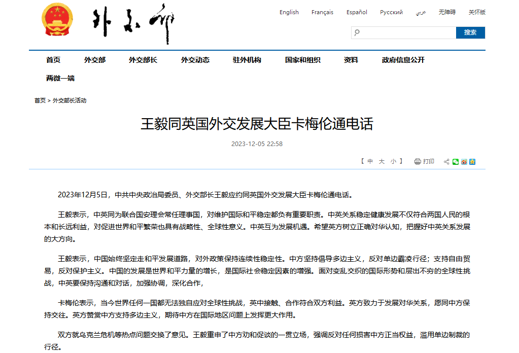 香港中通社12月6日電 中共中央政治局委員、外交部長王毅5日應約同英國外交發展大臣卡梅倫通電話。王毅表示,中英同為聯合國安理會常任理事國,對維護國際和平穩定都負有重要職責。