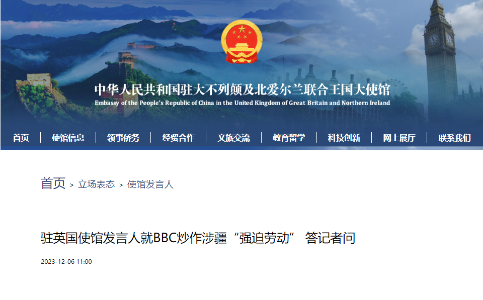 香港新聞網12月7日電 據中國駐英國大使館網站6日消息,駐英國使館發言人就BBC炒作涉疆“強迫勞動” 答記者問。