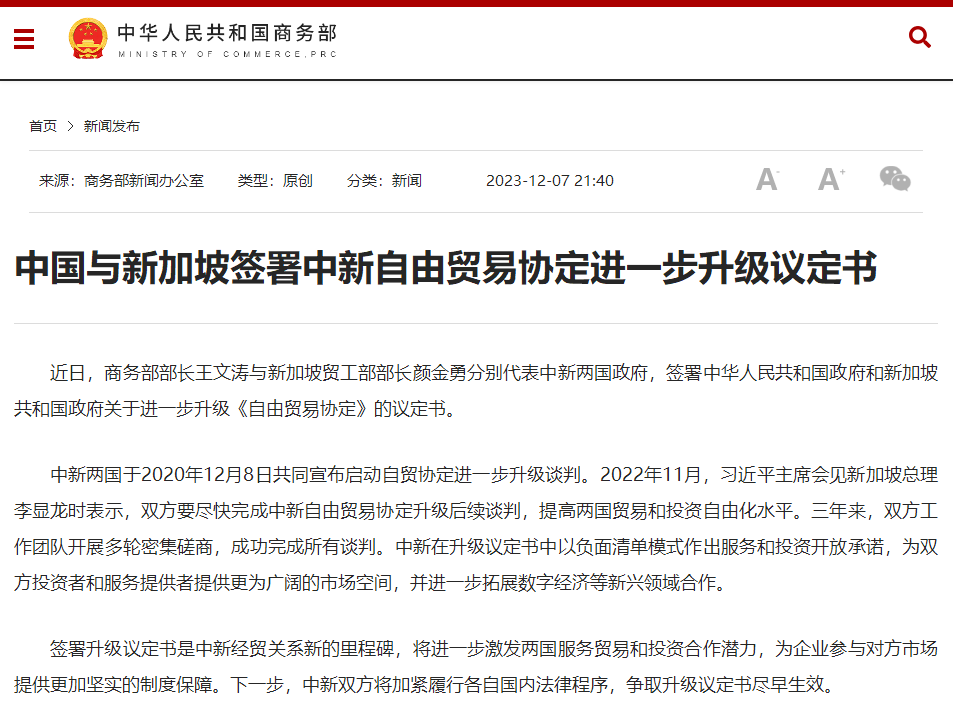 香港新聞網12月8日電 據中國商務部7日消息,中華人民共和國政府和新加坡共和國政府關於進一步升級《自由貿易協定》的議定書於近日簽署。