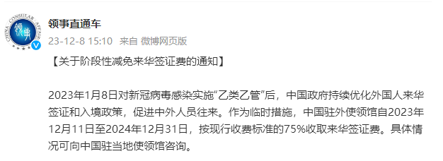 香港新聞網12月8日電  8日,中國外交部領事保護中心官方微博@領事直通車 發佈關於階段性減免來華簽證費的通知。