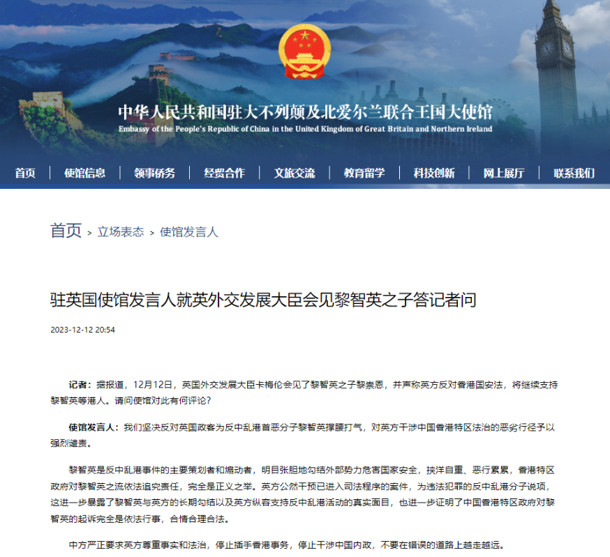 中國駐英國大使館網站截圖 記者:據報道,12月12日,英國外交發展大臣卡梅倫會見了黎智英之子黎崇恩,並聲稱英方反對香港國安法,將繼續支持黎智英等港人。請問使館對此有何評論? 使館發言人:我們堅決反對英國政客為反中亂港首惡分子黎智英撐腰打氣,對英方干涉中國香港特區法治的惡劣行徑予以強烈譴責。 黎智英是反中亂港事件的主要策劃者和煽動者,明目張膽地勾結外部勢力危害國家安全,挾洋自重、惡行累累,香港特區政府對黎智英之流依法追究責任,完全是正義之舉。英方公然干預已進入司法程序的案件,為違法犯罪的反中亂港分子說項,這進一步暴露了黎智英與英方的長期勾結以及英方縱容支持反中亂港活動的真實面目,也進一步證明了中國香港特區政府對黎智英的起訴完全是依法行事,合情合理合法。 中方嚴正要求英方尊重事實和法治,停止插手香港事務,停止干涉中國內政,不要在錯誤的道路上越走越遠。(完) 【編輯:丘志彬】