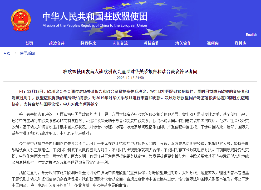 中國駐歐盟使團網站截圖 有記者問,12月12日,歐洲議會全會通過對華關係報告和“歐盟—台灣”貿易投資關係決議。報告稱歐盟應根據新的地緣政治背景,對2019年對華關係戰略進行審查和更新。決議呼籲歐盟同台灣簽署投資協定和韌性供應鏈協定,支持台參與國際論壇。中方對此有何評論? 中國駐歐盟使團發言人表示,有關報告和決議一方面認為中國是歐盟的夥伴,另一方面大幅渲染中歐意識形態和價值觀差異,突出雙方是制度性對手,甚至倒打一耙,誣稱中方主動將中歐關係核心轉向制度性對手。這種說法無助於改善和發展中歐關係,中方不能認同。 發言人強調,有關報告和決議妄議中國的政治、經濟、社會和外交政策,基於偏見和謊言攻擊抹黑中國人權狀況,對涉台、涉疆、涉藏、涉港澳等問題指手畫腳,嚴重侵犯中國主權,干涉中國內政,違背了國際關係基本準則和歐方政治承諾,中方表示堅決反對。 發言人表示,2023年是中歐建立全面戰略夥伴關係20周年。中歐作為兩大力量、兩大市場、兩大文明,有責任共同為世界提供更多穩定性,為發展提供更多推動力。中歐關係尤其不應被意識形態和地緣政治裹挾綁架,衝突對抗對雙方和全世界有百害而無一利。 發言人指出,在此次歐洲議會全會討論中,部分議員強調中國是歐盟的重要夥伴,呼籲歐盟增進對話、妥處分歧,這些客觀、理性聲音不應被基於意識形態偏見和虛假信息的雜音所埋沒。中方敦促歐洲議會以全面、客觀態度看待中國發展與進步,恪守國際法和國際關係基本準則,停止干涉中國內政,停止發表不負責任的言論,多做有益於中歐關係發展的事情。(完) 【編輯:丘志彬】