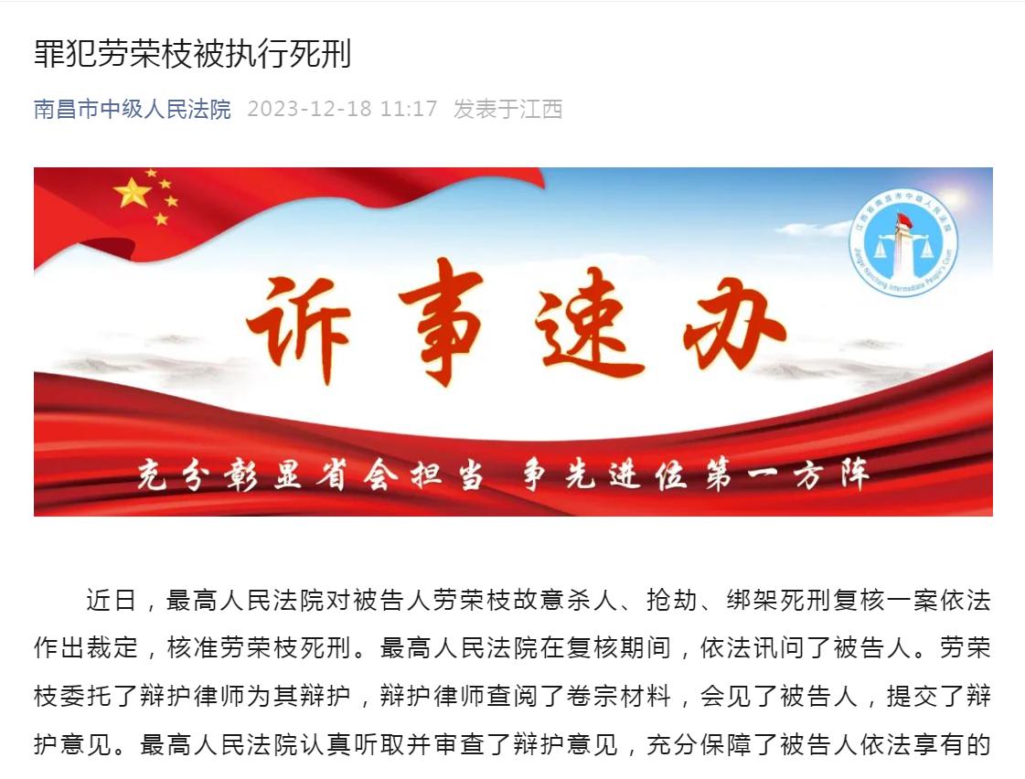 罪犯勞榮枝被依法執行死刑香港新聞網12月18日電 據南昌市中級人民法院消息,近日,最高人民法院對被告人勞榮枝故意殺人、搶劫、綁架死刑覆核一案依法作出裁定,核准勞榮枝死刑。 據大皖新聞報道,18日上午,記者撥通被害人“小木匠”的妻子朱大紅電話,“我還不知道消息,終於給死者一個交代了,大快人心,等了好久啊,終於核准下來了。”朱大紅說。 罪犯勞榮枝被執行死刑 據南昌市中級人民法院消息,近日,最高人民法院對被告人勞榮枝故意殺人、搶劫、綁架死刑覆核一案依法作出裁定,核准勞榮枝死刑。最高人民法院在覆核期間,依法訊問了被告人。勞榮枝委託了辯護律師為其辯護,辯護律師查閱了卷宗材料,會見了被告人,提交了辯護意見。最高人民法院認真聽取並審查了辯護意見,充分保障了被告人依法享有的訴訟權利。江西省南昌市中級人民法院向勞榮枝送達了最高人民法院刑事裁定。勞榮枝向被害人親屬表達歉意。2023年12月18日上午,南昌市中級人民法院遵照最高人民法院下達的執行死刑命令,對勞榮枝執行了死刑。南昌市人民檢察院依法派員臨場監督。南昌市中級人民法院在執行前安排勞榮枝會見了近親屬。