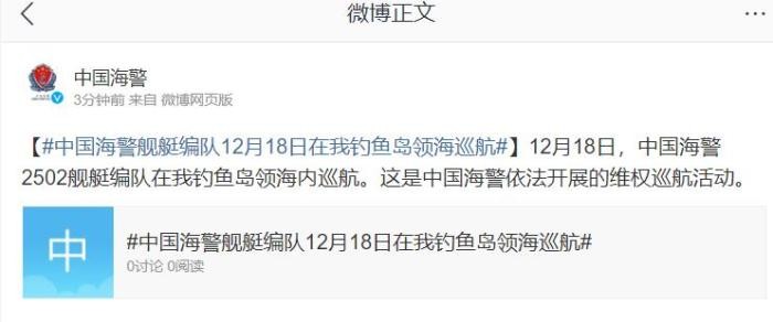 香港新聞網12月18日電 據中國海警官方微博消息,12月18日,中國海警2502艦艇編隊在中國釣魚島領海內巡航。這是中國海警依法開展的維權巡航活動。