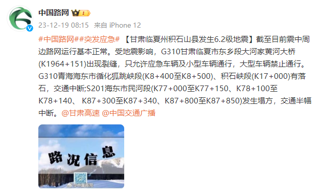 香港新聞網12月19日電 甘肅臨夏州積石山縣18日深夜發生6.2級地震。中國交通部路網監測與應急處置中心19日通報稱,截至目前震中周邊路網運行基本正常。受地震影響,G310甘肅臨夏市東鄉段大河家黃河大橋(K1964+151)出現裂縫,只允許應急車輛及小型車輛通行,大型車輛禁止通行。 G310青海海東市循化狐跳峽段(K8+400至K8+500)、積石峽段(K17+000)有落石,交通中斷;S201海東市民河段(K77+000至K77+150、K78+100至K78+140、 K87+300至K87+340、K87+800至K87+850)發生塌方,交通半幅中斷。