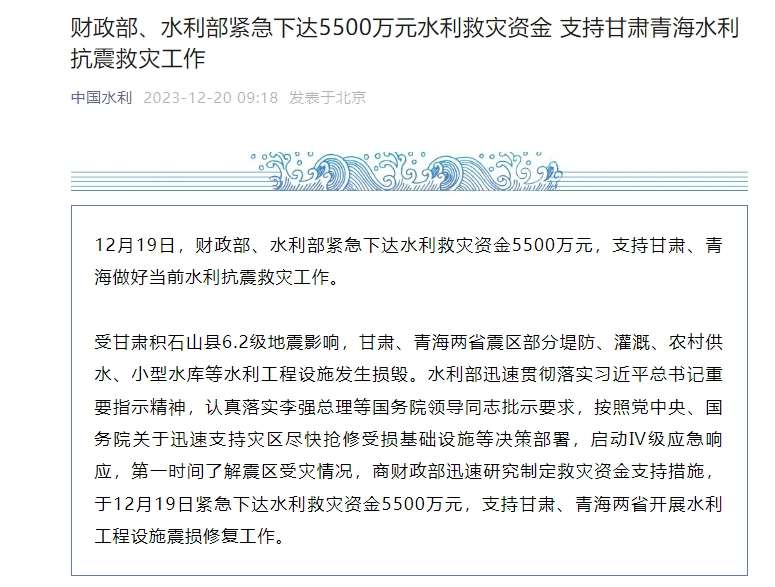 香港新聞網12月20日電 根據“中國水利”微信公眾號消息,12月19日,中國財政部、水利部緊急下達水利救災資金5500萬元,支持甘肅、青海做好當前水利抗震救災工作。
