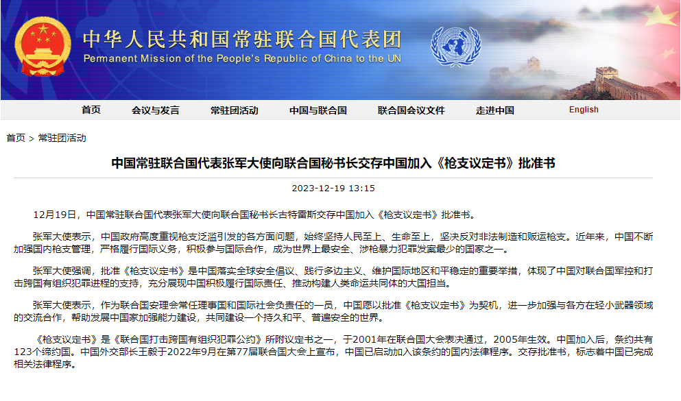 中國駐聯合國代表團網站截圖 據中國常駐聯合國代表團官網消息,張軍表示,中國政府高度重視槍支泛濫引發的各方面問題,始終堅持人民至上、生命至上,堅決反對非法製造和販運槍支。近年來,中國不斷加強國內槍支管理,嚴格履行國際義務,積極參與國際合作,成為世界上最安全、涉槍暴力犯罪發案最少的國家之一。 張軍強調,批准《槍支議定書》是中國落實全球安全倡議、踐行多邊主義、維護國際地區和平穩定的重要舉措,體現了中國對聯合國軍控和打擊跨國有組織犯罪進程的支持,充分展現中國積極履行國際責任、推動構建人類命運共同體的大國擔當。 張軍表示,作為聯合國安理會常任理事國和國際社會負責任的一員,中國願以批准《槍支議定書》為契機,進一步加強與各方在輕小武器領域的交流合作,幫助發展中國家加強能力建設,共同建設一個持久和平、普遍安全的世界。 《槍支議定書》是《聯合國打擊跨國有組織犯罪公約》所附議定書之一,於2001年在聯合國大會表決通過,2005年生效。中國外交部長王毅於去年9月在第77屆聯合國大會上宣佈,中國已啟動加入該條約的國內法律程序。交存批准書,標誌著中國已完成相關法律程序。(完) 【編輯:丘志彬】