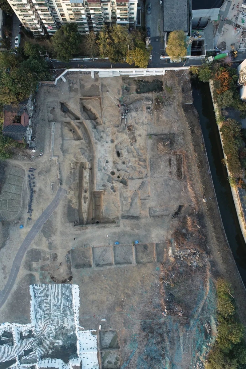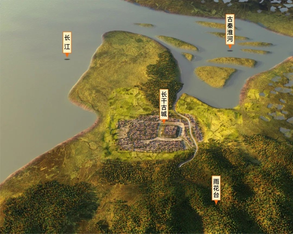 長幹古城地理環境示意圖,本文圖片均來自南京市考古研究院微信公眾號 長幹古城位於南京市秦淮區中華門外、大報恩寺遺址西側,處古長幹腹地,屬南京市“長幹裏古居民區及越城遺址區”地下文物重點保護區範圍。 2017年以來,南京市考古研究院對西街遺址開展考古發掘工作,截至目前,共計發掘面積12000平方米,發現各類遺跡500餘處,出土各類考古標本10000餘件,一座距今3000多年的長幹古城初顯真容。 長幹古城由一處中心台地以及台地外圍環壕、墻基與門道、水井、豬祭祀坑等與築城有關的遺跡組成。這座古城最早至商代晚期,南京湖熟文化先民利用中心台地築城,外有長江、秦淮河、花露崗、雨花台、赤石磯等江河與崗阜為天然屏障,具有鮮明的軍事要塞性質。台地外圍多道不同時代環壕的發現,提供了古城修築和不斷使用的證據,更是將南京主城區建城時間提前至商代晚期。 長幹古城出土的商周時期遺物較為豐富,有陶鬲、陶甗、陶鼎、陶豆、陶簋、陶觶形杯、陶斝、原始瓷罐、原始瓷豆、玉璧、銅塊等。很多出土標本在造型、紋飾等方面體現出南北文化交流交融、中華文明多元一體的特征。