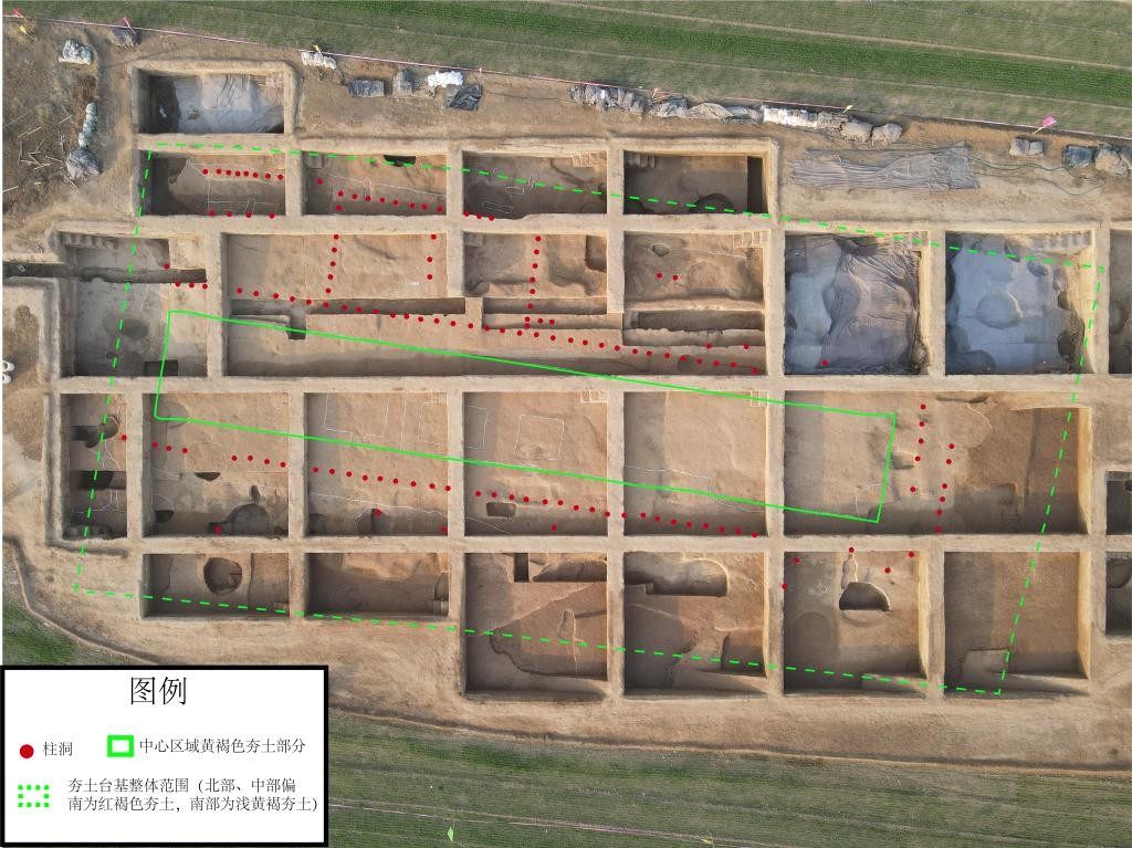 古城寨遺址1號夯土台基平面初步想象復原圖 在1號夯土台基東側,考古人員還發現一處夯土遺跡,目前已揭露部分南北長25米、東西寬約10米,與1號夯土台基應為同一組建築。 “結合以往考古發掘成果來看,古城寨遺址城內中部偏東區域為宮殿核心區。”李博說,“新發現的1號夯土台基、東部夯土遺跡,與以往發現的宮殿建築基址、廊廡基址一道,在平面布局上構成了四合院式的宮殿建築群。” 李博表示,新發現刷新了對古城寨遺址城內布局結構的認知,也為探索夏代宮殿建築的起源與發展提供了新的重要材料。 下一步,考古工作人員將繼續深入研究1號夯土台基的性質、營建背景、建築特征等,並圍繞古城寨遺址宮殿核心區的規模、布局及周邊道路系統等問題進行更加全面的勘探和精細的發掘工作。(完) 【編輯:丘志彬】