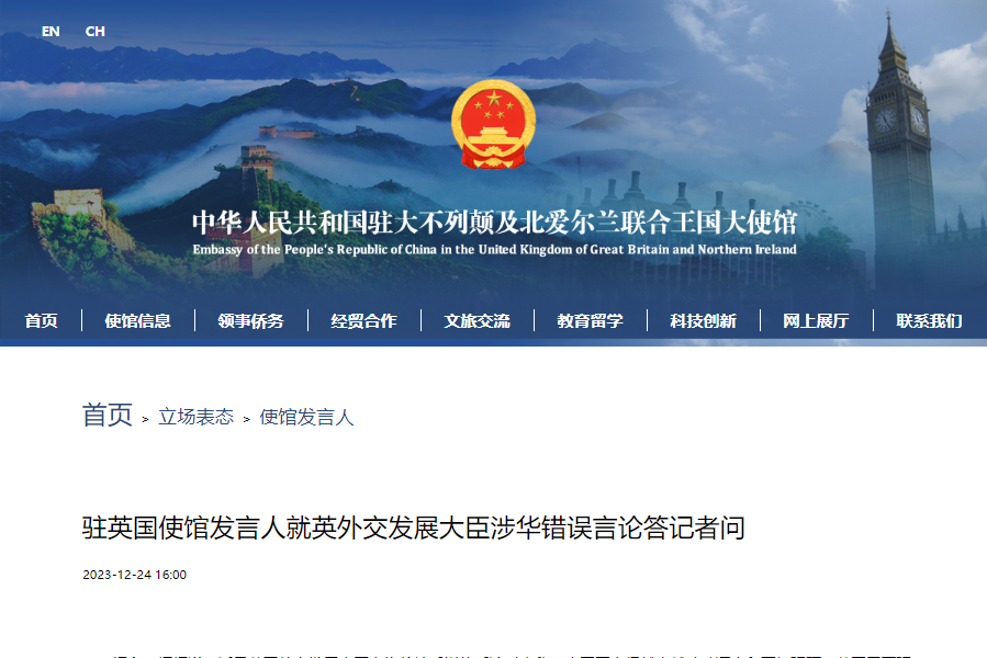 中國駐英國大使館網站截圖 記者:據報道,近日英國外交發展大臣卡梅倫接受媒體採訪時聲稱,中國正變得越來越咄咄逼人和更加強硬,英國需要強化安全措施以應對網絡攻擊等問題,卡並再次聲稱香港國安法違反《中英聯合聲明》,黎智英應被釋放,請問使館對此有何評論? 使館發言人:關於英方的類似言論,我前幾天已做了回應。 我們堅決反對英方官員對中方的無端指責,堅決反對英方干涉中國內政。 咄咄逼人不是中國的傳統。中國一貫奉行獨立自主的和平外交政策,是各國發展的夥伴和機遇,不是威脅和挑戰。我們始終致力於在相互尊重、互利共贏基礎上發展同各國的關係,同時堅決維護自身主權、安全和發展利益。 網絡安全是全球性挑戰。中方一貫堅決依法打擊網絡攻擊,主張各國通過對話與合作共同維護網絡安全。中方反對將網絡安全問題政治化,反對在沒有事實依據的情況下抹黑他國。 所謂香港國安法“違反《中英聯合聲明》”完全是個偽命題。中國政府管治香港的依據是中國憲法和香港基本法,而非《中英聯合聲明》。香港國安法根據中國憲法而制定,並通過基本法成為香港法律制度的組成部分。《聯合聲明》的核心要義是確保中國收回香港,香港回歸後,《聯合聲明》的歷史使命已經完成。英國無權借口《聯合聲明》干預香港事務、干涉中國內政。關於黎智英案,中方已多次闡明嚴正立場。中方要求英方尊重事實和法治,停止為反中亂港首惡分子撐腰打氣,停止干涉香港事務和中國內政。 我們敦促英方摒棄冷戰思維,停止散布“中國威脅論”,客觀理性看待中國和中英關係,同中方相向而行,推動兩國關係健康穩定發展。(完) 【編輯:丘志彬】
