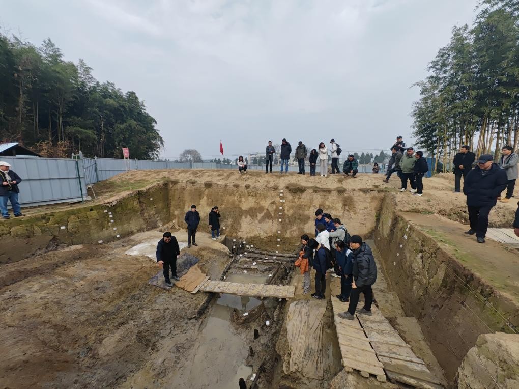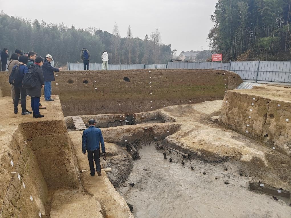 專家2023年12月30日考察商代水門遺跡。新華社記者馮源 攝 據新華社報道,小古城遺址考古發現學術研討會2023年12月29日至31日在浙江杭州舉行。浙江省文物考古研究所小古城考古項目負責人羅汝鵬研究員在研討會上介紹,小古城遺址發現於上世紀80年代。2004年至今,研究所持續對其進行考古發掘,成果豐富。 據介紹,小古城遺址的湖西發掘區發現一處格局複雜、但規劃整齊統一的商代院落型建築群。在廟山發掘區,考古確定廟山山頂存在一座建築工藝極為特殊的人工堆築台體,其佔地面積超過1800平方米,相對高度達8米至12米,台體氣勢宏偉,精準地按照東西南北四個方位進行堆築。它的表面還可以看到用不同顏色填土分層版築的痕跡。台體在“台頂”和“台腳”都有建築遺跡,尤其是台頂的建築,明顯具有特殊功能性意義。在北城墻發掘區,一座商代水門遺跡保存較好,結構清晰,寬2.5米—3米,留有豐富的木構件遺物。