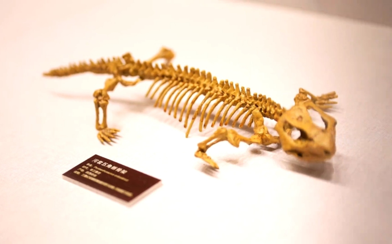 中國古動物館外觀(宣傳片截圖) 該館展品主要來自中國科學院古脊椎動物與古人類研究所,目前館裡陳列的展品總計約6000件左右。展品中不乏珍品,包括世界唯一的中華猛龍骨架標本;已知時代最早的有頜魚類——奇跡秀山魚;世界極少數三維保存的天山哈密翼龍蛋;中國最著名的蜥腳類恐龍——合川馬門溪龍;世界上臉最長、個體最大的馬——埃氏馬頭骨等化石標本。