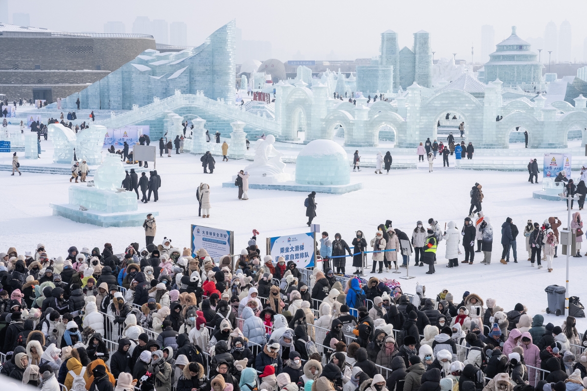 游客在哈爾濱冰雪大世界園區排隊,等待體驗超級冰滑梯(1月1日攝)。 新華社 圖