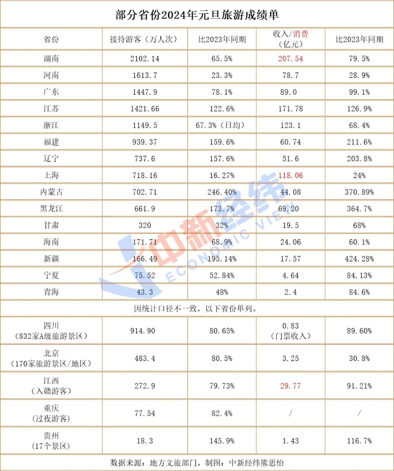 據中新經緯不完全統計,截至1月3日21時,中國已有20省份發佈2024年元旦旅遊數據。其中,湖南接待遊客2102.14萬人次,暫時領跑全國;河南接待遊客1613.7萬人次,位列第二;廣東接待遊客1447.9萬,排名第三。此外,江蘇、浙江兩省遊客接待量也超過千萬。 從旅遊收入/消費來看,“湖南遊”遊客總花費達207.54億元,暫列排行榜第一名;江蘇緊隨其後,實現旅遊總收入171.78億元;此外,浙江實現旅遊收入123.1億元,上海實現旅遊消費118.06億元,均超百億。 從旅遊市場恢復速度看,新疆或拔得頭籌。元旦3天假期,新疆實現旅遊收入17.57億元,同比增長424.28%。其次是內蒙古,元旦假期3天實現國內旅遊收入44.08億元,同比增長370.89%。 哈爾濱遊客、收入達峰值 近期,“南方小土豆”帶火東北冰雪遊。據哈爾濱市文化廣電和旅遊局提供大數據測算,元旦假期3天,哈爾濱市累計接待遊客304.79萬人次,實現旅遊總收入59.14億元。遊客接待量與旅遊總收入達到歷史峰值。 哈市商務局對農批市場、商場、超市、汽車、家電、餐飲、住宿、電商等重點企業監測數據顯示,激增的遊客量,帶動住宿、餐飲量上漲,住宿、餐飲企業銷售額同比增長129.4%。 哈爾濱市所在省份——黑龍江,2024元旦期間累計接待遊客661.9萬人次,同比增長173.7%,高出全國增幅18.4個百分點;旅遊收入69.20億元,同比增長364.7%,高出全國增幅164個百分點。 2023年12月31日,黑龍江省發佈《致海內外遊客朋友們的新年感謝信》提到,冰雪季來臨之初,全省啟動了冬季旅遊“百日行動”,推出“十”大主題路線、“百”場美食盛宴、“千”台文旅盛事和“萬”種龍江好物。 儘管如此,黑龍江仍稱,“這個冬天,把很多龍江人都‘整不會了’!” 另據同程旅行數據,元旦首日,得益於旺盛的冰雪旅遊帶動,沈陽酒店預訂量同比上漲166%,長春和哈爾濱的酒店預訂量同比漲幅分別為142%和129%。 郵輪遊成國際遊新選擇 中國國內遊如火如荼,國際遊也不甘落後。據中國國家移民管理局統計,今年元旦假期全國邊檢機關共查驗出入境人員517.9萬人次,日均172.6萬人次,較2023年元旦假期增長4.7倍,已恢復至2019年同期水平。 航旅縱橫大數據顯示:2024年元旦假期間,泰國位於出國熱門目的地第一位;前往泰國的民航旅客量近4萬人次;我國赴泰旅客人數最多的前5個城市為:上海、北京、中國香港、廣州、成都。 據中國國家移民管理局官微消息,泰國總理賽塔1月2日在曼谷表示,泰國將自2024年3月1日起對中國公民實施永久免簽政策。同程研究院相關負責人分析,此次永久互免簽證政策為遊客釋放了更為積極的信號,將利好中國和泰國之間的旅遊和商務往來。 此外,郵輪遊成為國際遊新選擇。2024年1月1日,中國第一艘國產大型郵輪愛達·魔都號在上海吳淞口國際郵輪港開啟商業首航。據悉,元旦首航的船票攜程平台提前一個半月售罄。不僅如此,同程旅行數據顯示,2024元旦假期,國際郵輪遊熱度上漲63%。 展望後市,中國旅遊研究院預計,2024年國內旅遊出遊人數、國內旅遊收入將分別超過60億人次和6萬億元,入出境旅遊人次和國際旅遊收入將分別超過2.64億人次、1070億美元。(完) 【編輯:丘志彬】