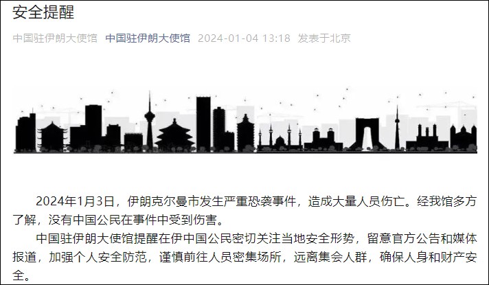 香港新聞網1月4日電 微信公眾號“中國駐伊朗大使館”1月4日發佈安全提醒稱,2024年1月3日,伊朗克爾曼市發生嚴重恐襲事件,造成大量人員傷亡。中國駐伊朗大使館表示,經多方了解,沒有中國公民在事件中受到傷害。 中國駐伊朗大使館提醒在伊中國公民密切關注當地安全形勢,留意官方公告和媒體報道,加強個人安全防範,謹慎前往人員密集場所,遠離集會人群,確保人身和財產安全。 如遇緊急情況,請及時報警並聯繫駐伊使領館,以獲取必要的領事保護與協助。 相關聯繫電話: 伊朗急救電話:115 伊朗報警電話:110 中國外交部全球領事保護與服務應急呼叫中心電話:+86-10-12308或+86-10-59913991 中國駐伊朗大使館領事保護與協助電話:+98-9122176035(完)