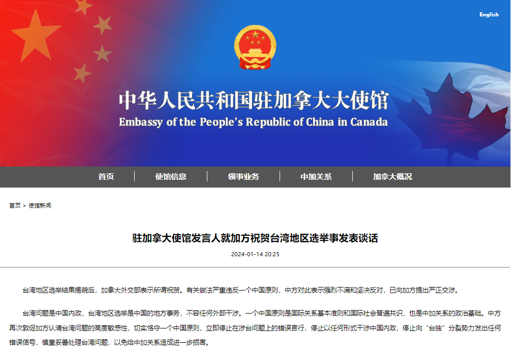 中國駐加拿大大使館網站截圖 台灣地區選舉結果揭曉後,加拿大外交部表示所謂祝賀。有關做法嚴重違反一個中國原則,中方對此表示強烈不滿和堅決反對,已向加方提出嚴正交涉。 台灣問題是中國內政,台灣地區選舉是中國的地方事務,不容任何外部干涉。一個中國原則是國際關係基本準則和國際社會普遍共識,也是中加關係的政治基礎。中方再次敦促加方認清台灣問題的高度敏感性,切實恪守一個中國原則,立即停止在涉台問題上的錯誤言行,停止以任何形式干涉中國內政,停止向“台獨”分裂勢力發出任何錯誤信號,慎重妥善處理台灣問題,以免給中加關係造成進一步損害。(完) 【編輯:丘志彬】