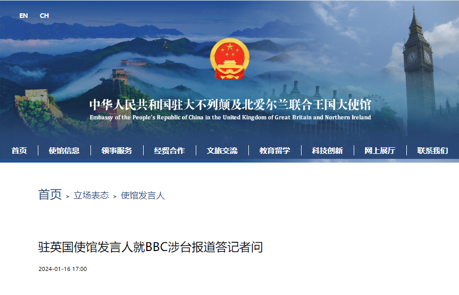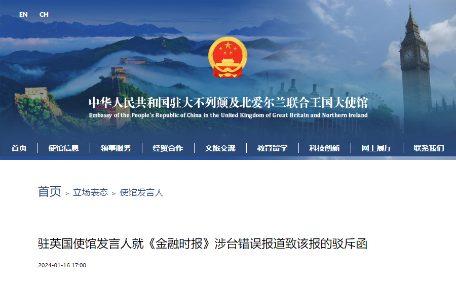 三家英媒刊發涉台錯誤報道,中使館均嚴正駁斥香港新聞網1月17日電 就三家英媒刊發涉台錯誤報道,中國駐英國大使館網站16日做出回應。