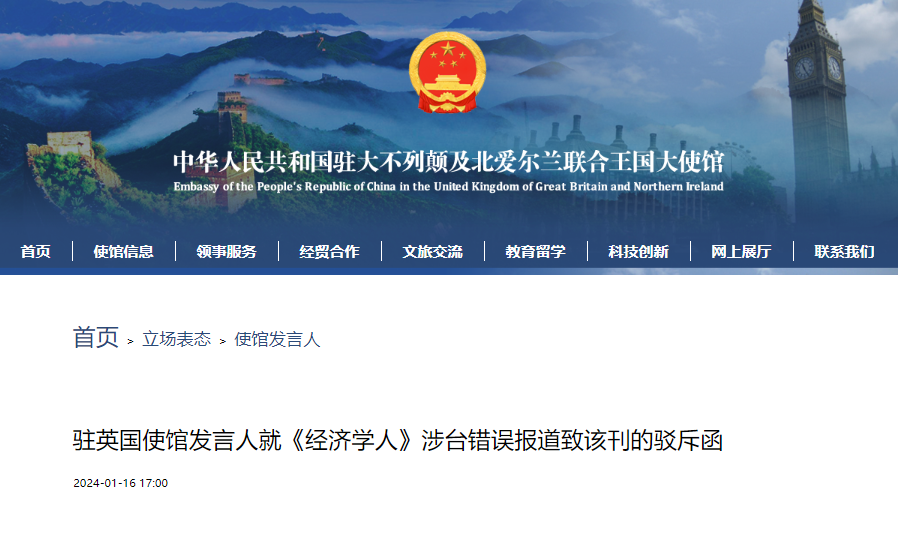 近日,駐英國使館發言人致函英國《經濟學人》,對其刊發涉台錯誤報道予以嚴正駁斥。全文如下: 《經濟學人》網站1月3日刊發吳釗燮的文章《台灣“外交部長”談即將到來的選舉之利害關係》,是在為“台獨”提供炒作平台,助長“台獨”囂張氣焰,嚴重誤導公眾。吳是頑固“台獨分子”。他妄稱台灣為“國家”,明目張膽地鼓吹分裂國家,是典型的叛國者。 台灣自古屬於中國。鼓吹“台獨”是在歪曲台灣的歷史,割裂台灣的根脈。1894年日本發動侵略中國的甲午戰爭,次年迫使戰敗的清朝政府割讓台灣及澎湖列島。1943年的《開羅宣言》、1945年的《波茨坦公告》、1945年的《日本投降條款》以及中國政府宣告都表明中國從法律和事實上收復了台灣。1949年中華人民共和國成立後,成為代表全中國的唯一合法政府。這是在中國這一國際法主體沒有發生變化的情況下的政權更替。中華人民共和國政府理所當然地完全享有和行使中國的主權,包括對台灣的主權。 1971年,第26屆聯合國大會以壓倒性多數通過第2758號決議,明確恢復中華人民共和國的一切權利,承認中華人民共和國政府的代表為中國在聯合國組織的唯一合法代表。目前,世界上182個國家在一個中國原則基礎上與中國建立了外交關係,一個中國原則早已成為公認的國際關係準則和國際社會普遍共識。 台灣問題不是什麽民主問題,而是事關中國主權和領土完整的問題。吳釗燮散佈“民主對抗威權”虛假敘事,是搞假民主、真“台獨”,也是挑戰以聯合國為核心、國際法為基礎的國際秩序。 台灣問題與烏克蘭問題有著本質的區別。最根本的不同在於,台灣是中國領土不可分割的一部分,台灣問題完全是中國的內政,烏克蘭問題則是主權國家之間的爭端。把台灣問題與烏克蘭問題扯在一起,純屬別有用心,意在混淆是非,借烏克蘭危機蹭熱度。 台海的現狀是世界上只有一個中國,兩岸同屬一個中國。民進黨當局和縱容支持“台獨”分裂活動的外部勢力,才是破壞台海現狀、危害台海和平穩定的罪魁禍首。“挾洋謀獨”沒有出路,“以台制華”註定失敗。 我們敦促《經濟學人》不要為“台獨”分裂行徑提供誹謗炒作的平台,不要被誤導公眾的圖謀利用。