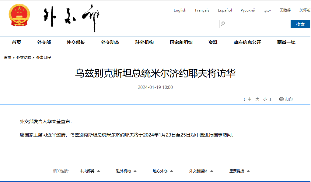 香港新聞網1月19日電 中國外交部網站1月19日消息,中國外交部發言人華春瑩宣佈:應國家主席習近平邀請,烏茲別克斯坦總統米爾濟約耶夫將於2024年1月23日至25日對中國進行國事訪問。(完)