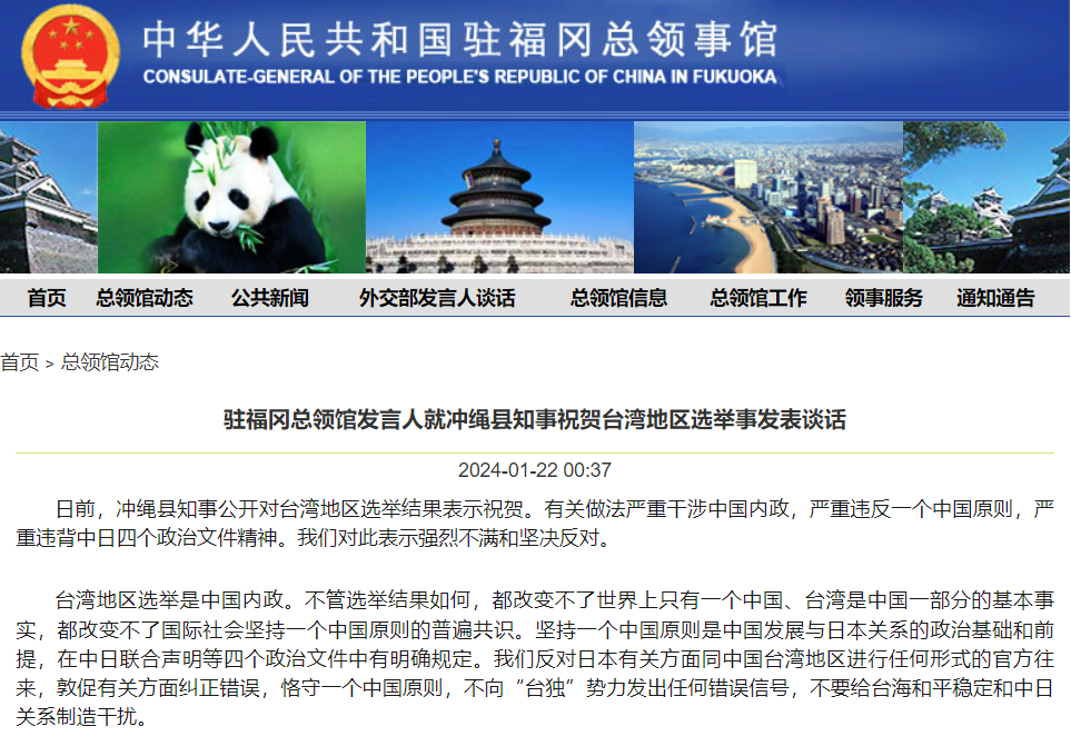 衝繩縣知事祝賀台灣地區選舉,中國駐福岡總領館回應分享到: