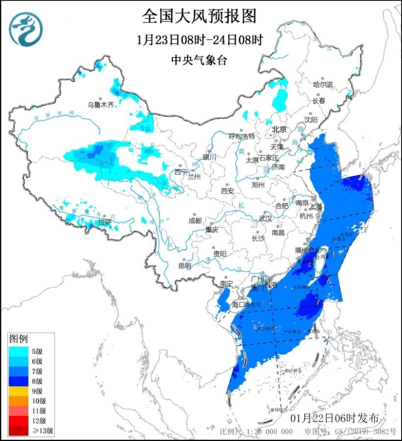 1月23日08時至24日08時,新疆北疆北部和東部、內蒙古中部、遼東半島、山東半島、江蘇沿海、上海、浙江沿海、福建沿海、廣東沿海及新疆南疆盆地和東部、甘肅河西等地有5~6級、陣風7級的大風;黃海大部海域、東海大部海域、台灣海峽、台灣以東洋面、巴士海峽、北部灣、南海北部和中部海域將有7~8級、陣風9~10級的偏北到東北風,其中台灣海峽部分海域風力可達9級、陣風10~11級。