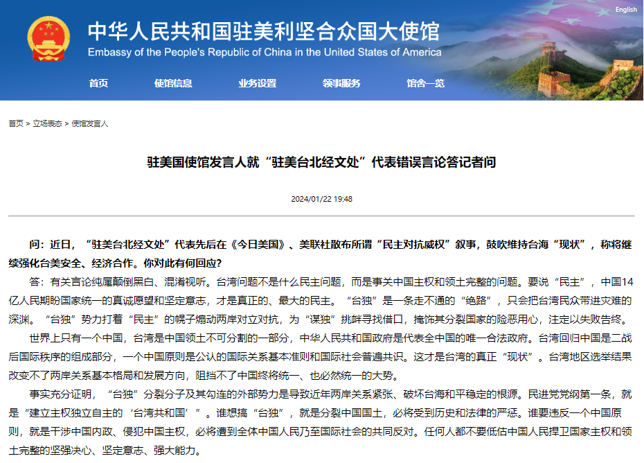 中國駐美國大使館網站截圖 發言人當日指出,要說“民主”,中國14億人民期盼國家統一的真誠願望和堅定意志,才是真正的、最大的民主。“台獨”是一條走不通的“絕路”,只會把台灣民眾帶進災難的深淵。“台獨”勢力打著“民主”的幌子煽動兩岸對立對抗,為“謀獨”挑釁尋找藉口,掩飾其分裂國家的險惡用心,註定以失敗告終。 發言人說,世界上只有一個中國,台灣是中國領土不可分割的一部分,中華人民共和國政府是代表全中國的唯一合法政府。台灣回歸中國是二戰後國際秩序的組成部分,一個中國原則是公認的國際關係基本準則和國際社會普遍共識。這才是台灣的真正“現狀”。台灣地區選舉結果改變不了兩岸關係基本格局和發展方向,阻擋不了中國終將統一、也必然統一的大勢。 發言人表示,事實充分證明,“台獨”分裂分子及其勾連的外部勢力是導致近年兩岸關係緊張、破壞台海和平穩定的根源。民進黨黨綱第一條,就是“建立主權獨立自主的‘台灣共和國’”。誰想搞“台獨”,就是分裂中國國土,必將受到歷史和法律的嚴懲。誰要違反一個中國原則,就是干涉中國內政、侵犯中國主權,必將遭到全體中國人民乃至國際社會的共同反對。任何人都不要低估中國人民捍衛國家主權和領土完整的堅強決心、堅定意志、強大能力。(完) 【編輯:丘志彬】